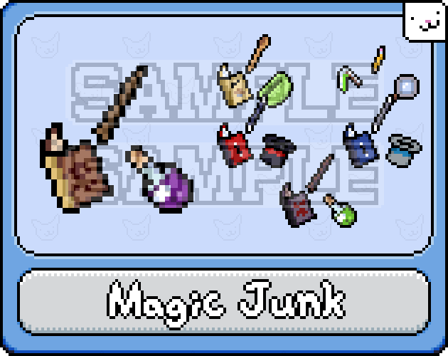Why not use magic to do more magic? Magic Junk was designed to fit in nicely with a turn-based battle system, but it can also be used as an enemy in any 2D game, or simply as an animated prop to spruce up your spellcaster's home. Other silly variants are included, like an enchanted kitchen set, magic kits, and a paranormal investigator.