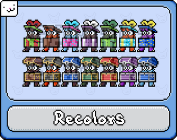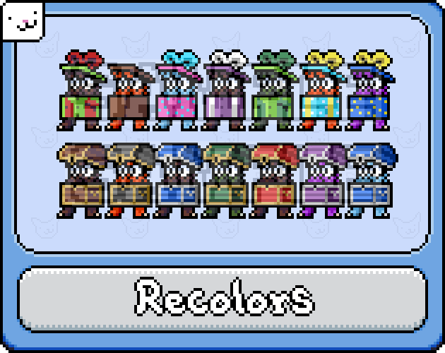 - 4 all-encompassing Aseprite files that contain all layers across all variants, as well as additional alternate colors, to help you make your own variants of the following by toggling layer group visibility: