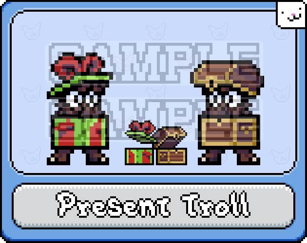 There's a real surprise in this box! The Present Troll is a real nuisance for unsuspecting holidays and birthday parties. Originally designed as a festive mimic, this asset pack also comes with a chest variant to provide a more familiar looking threat. The Present Troll was created with turn-based battle systems in mind, but it can also fit in as an enemy in 2D games. The pack additionally contains opening animations for both the present and the chest, without the troll, so you can hide real goodies in there, and make it easier for the mimics to blend in and fool players.
